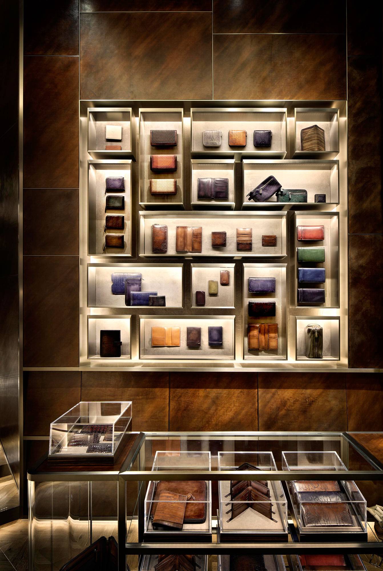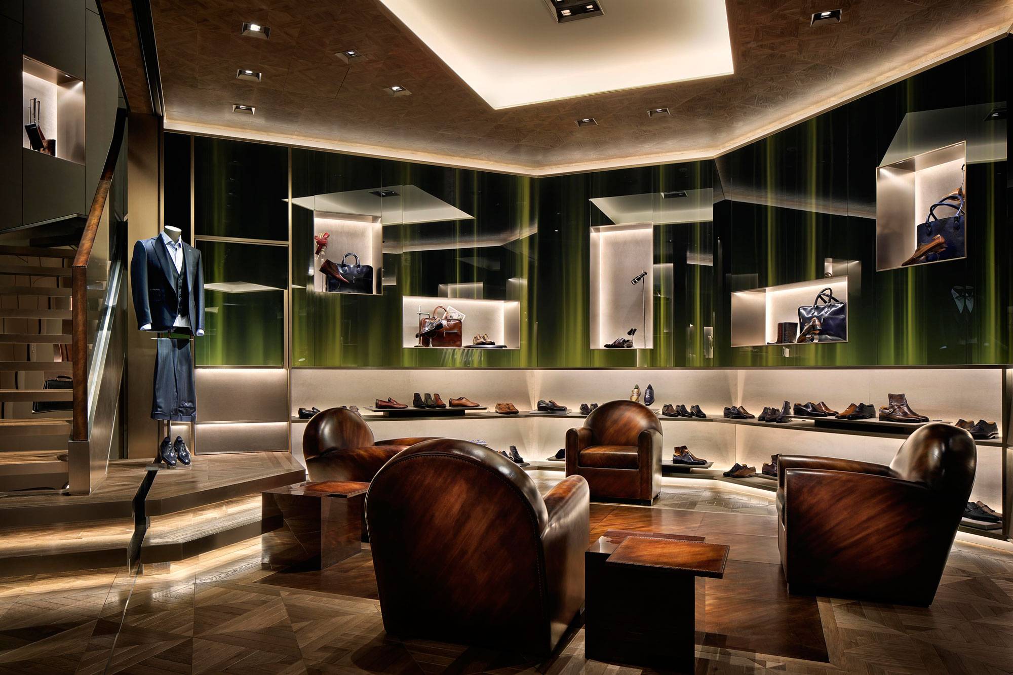 INTERIOR WORKS 2013.01.27 2013年銀座並木通りの路面にオープン。老舗の紳士靴ブランドからより多角的なメンズアパレルブランドに変革を遂げるベルルッティの一新されたブランドアイデンティティを、現代的なインテリアでクリアに表現した。クラブチェアからラウンジ感のあるゆったりとした空間に至るまで、ベルルッティを象徴するパティーナを取り入れたインテリア。伝統的なシューズの素材と細かなステッチまで精密に倣って製作したオリジナルのソファで、その世界観を強調する。 TOKYO, JAPAN 2013 201312_BG_001201312_BG_002201312_BG_003201312_BG_004201312_BG_005201312_BG_006201312_BG_007201312_BG_008201312_BG_009201312_BG_010201312_BG_011