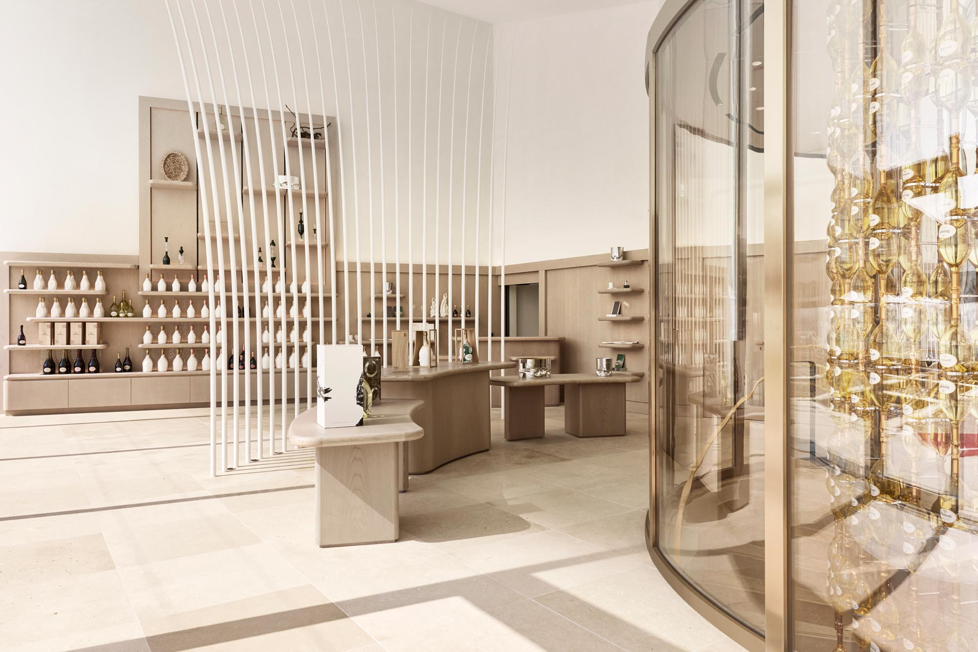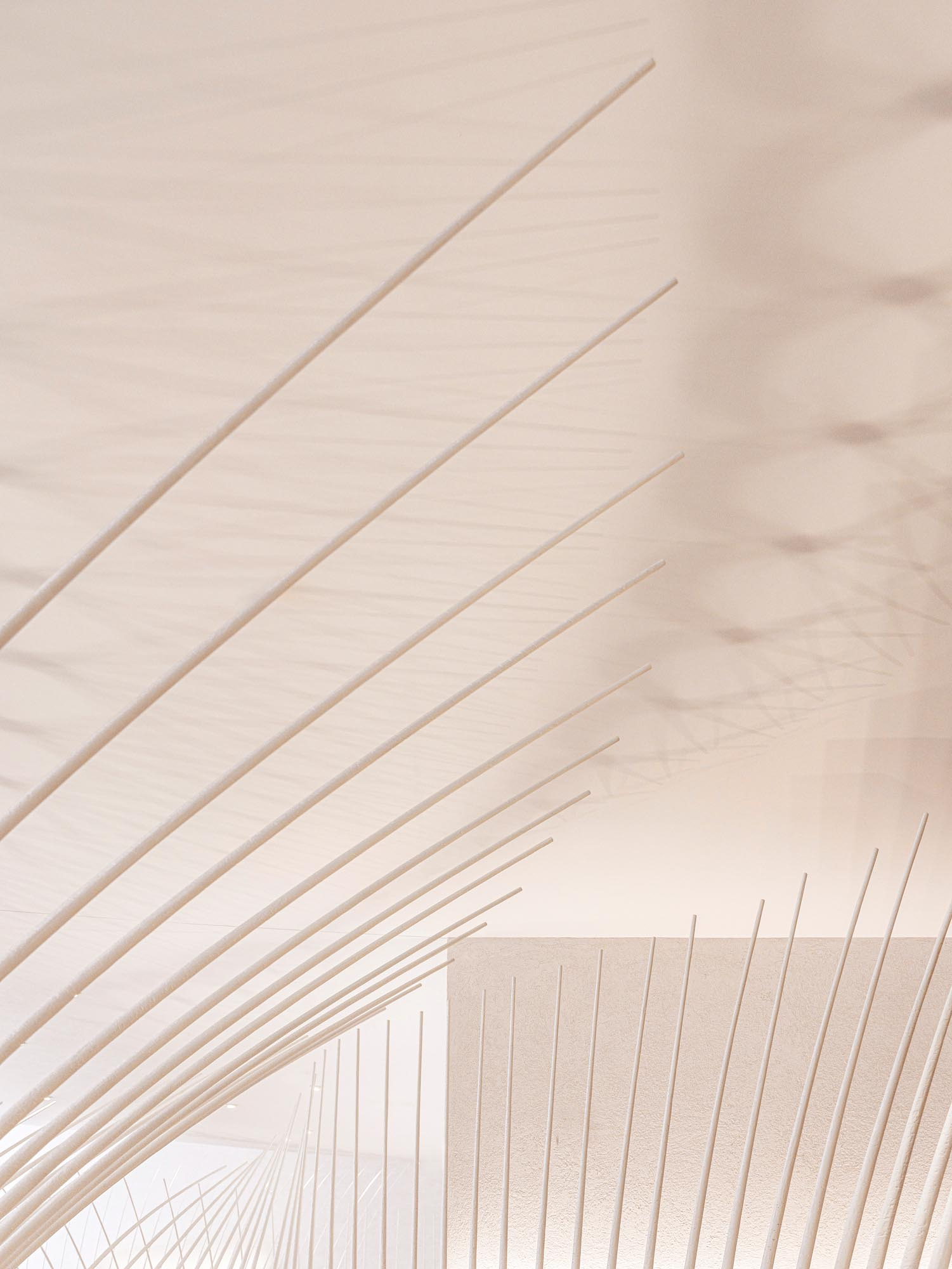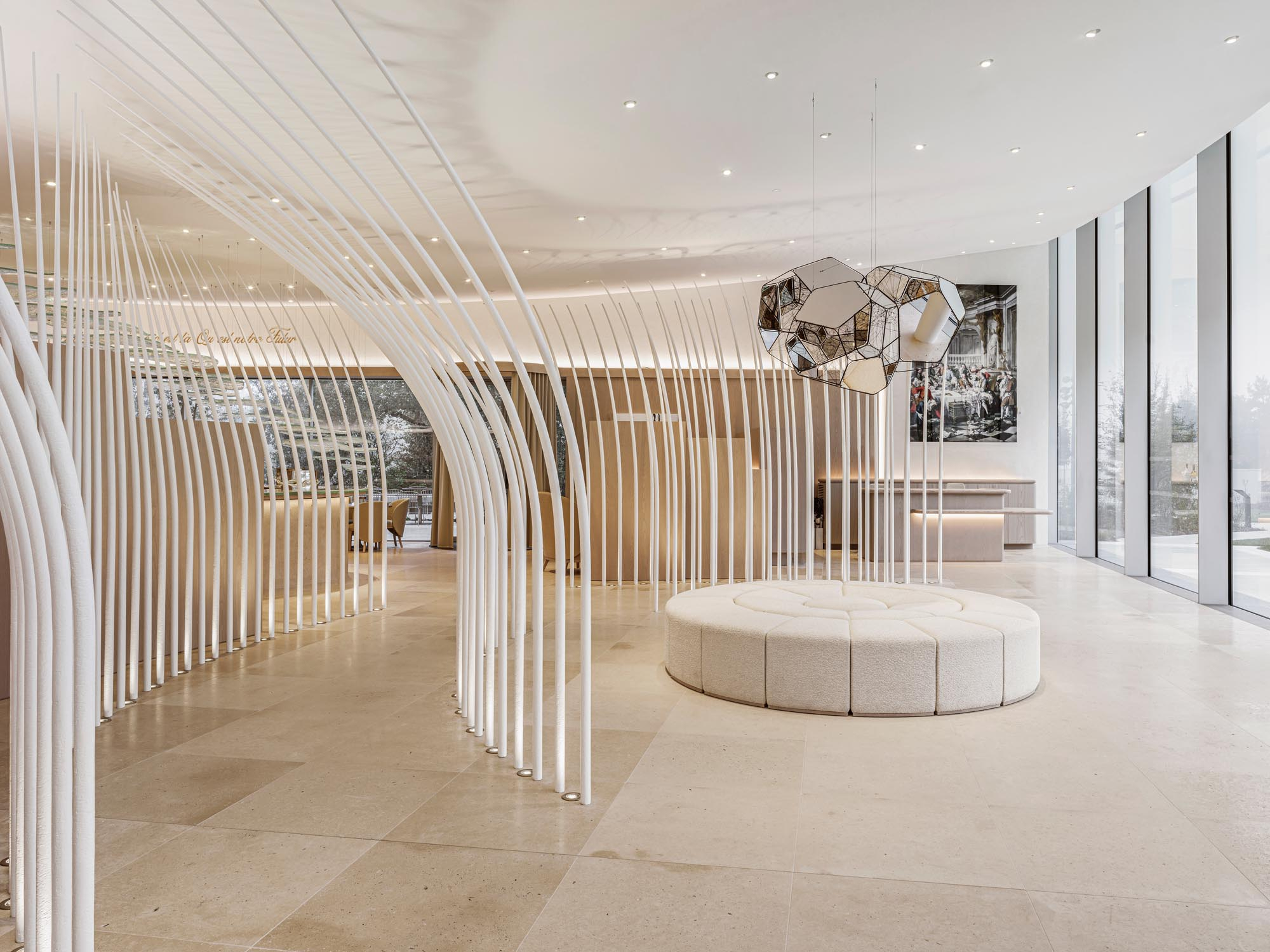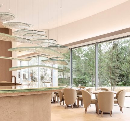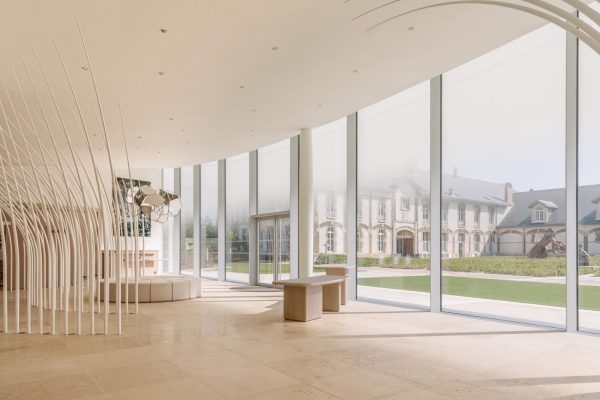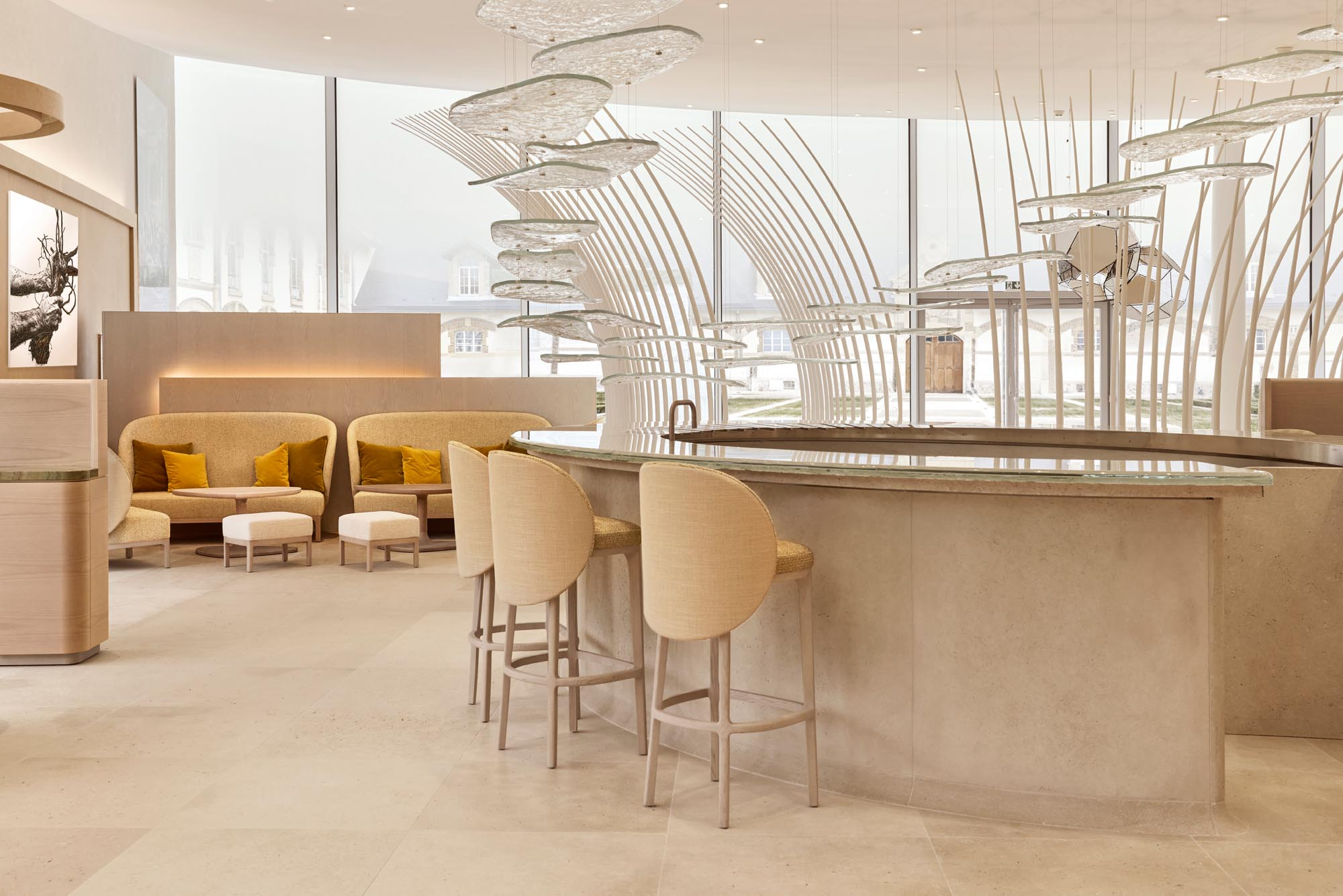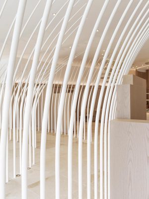 Maison Ruinartの本拠地で、世界最古のシャンパンが生まれた史跡としても知られる4 Rue des Crayere に新たに建てられたパビリオンのインテリア。コンセプトは室内庭園。本質的で明るく情緒的なRuinartの美意識が広がる流線的な空間に、床から天井に向かって伸びる繊細な枝が、屋外の遺跡や室内のオブジェに視線を集めるように訪問者を導く。未来へ向かうRuinartの変容を見せる空間を、藤本壮介氏の建築、クリストフ・ゴートラン氏の庭園と共鳴を意識してデザインした。