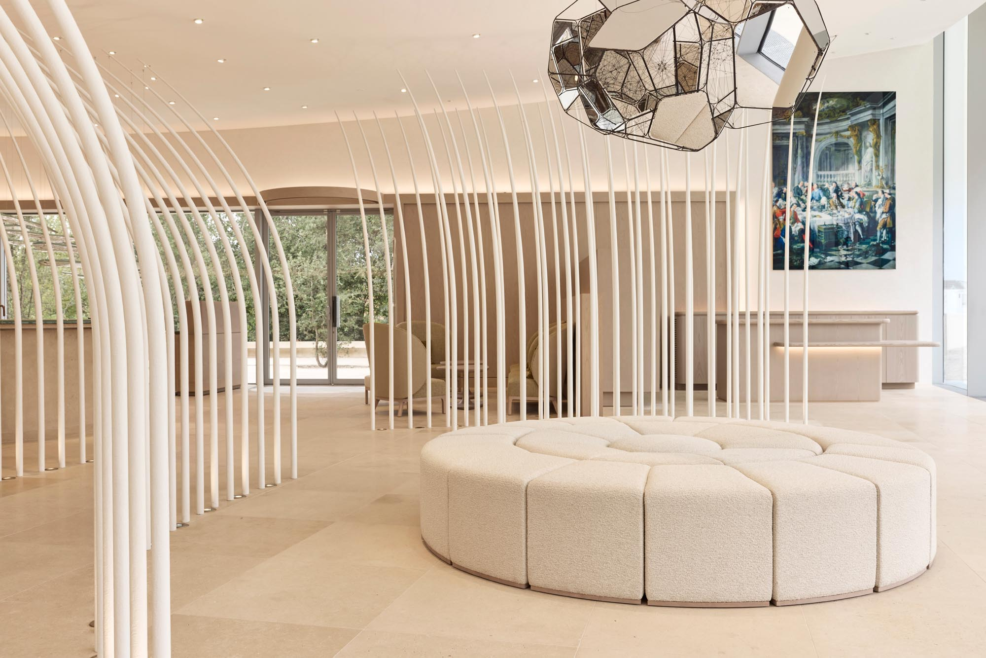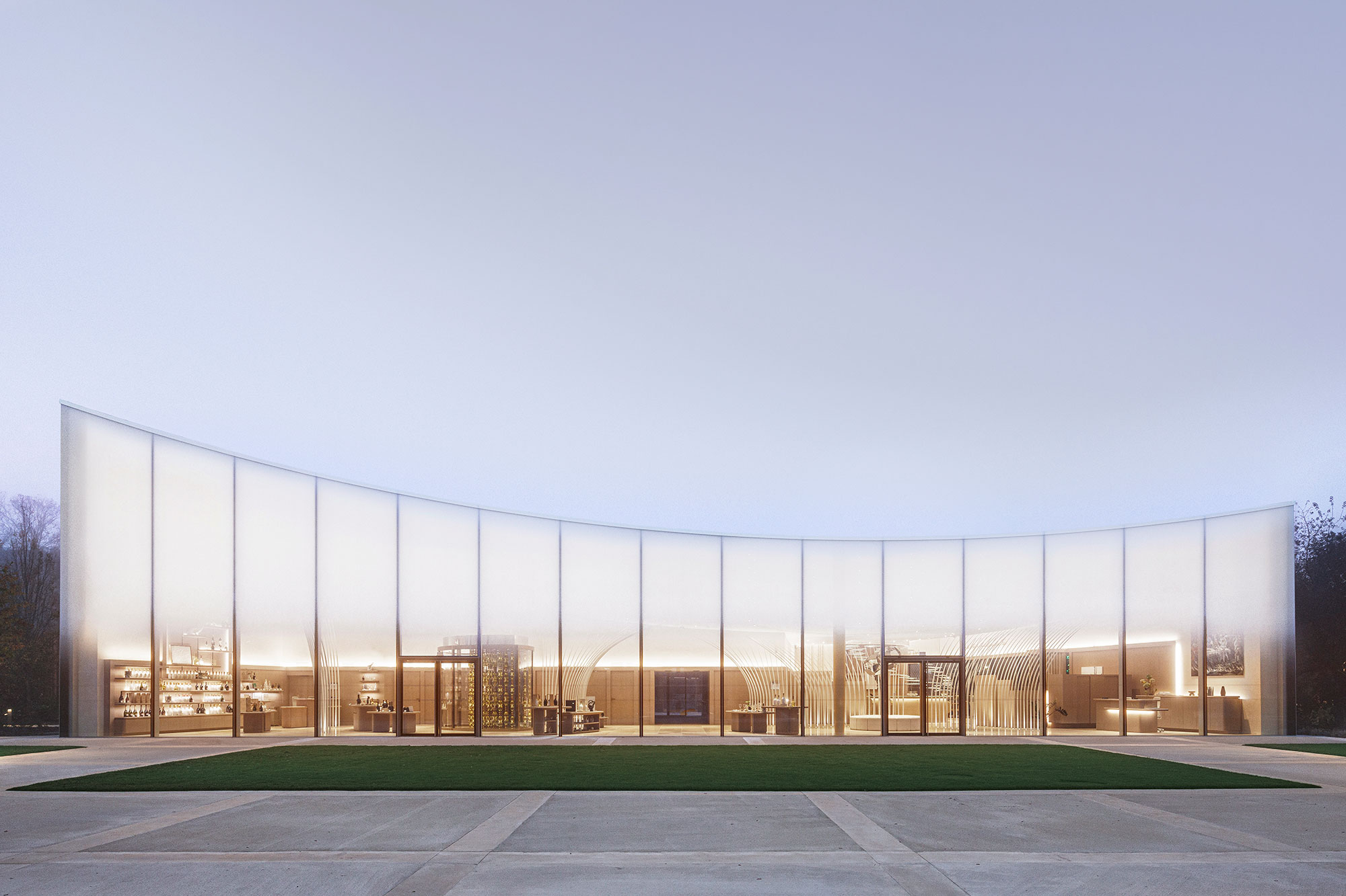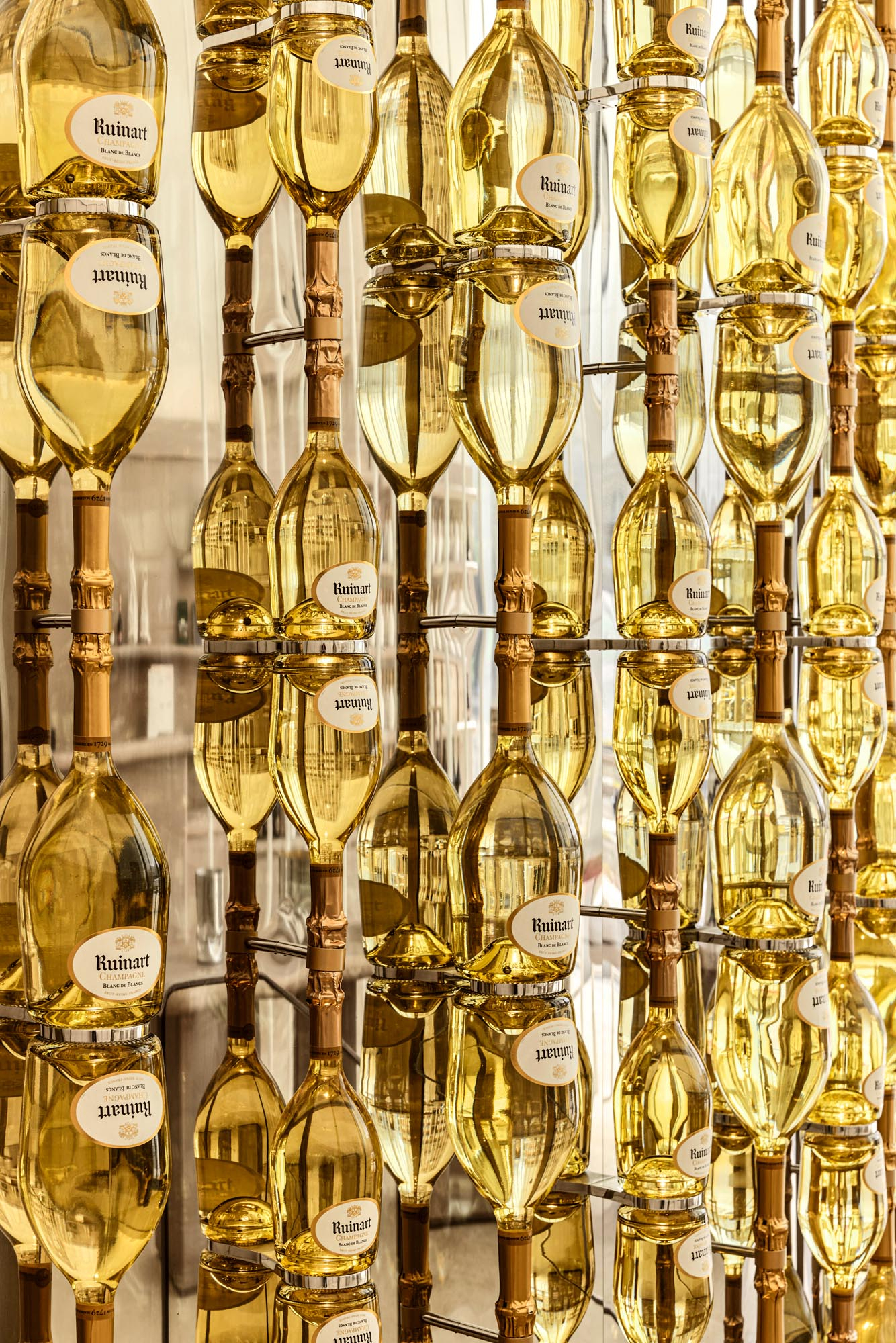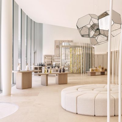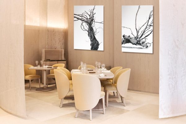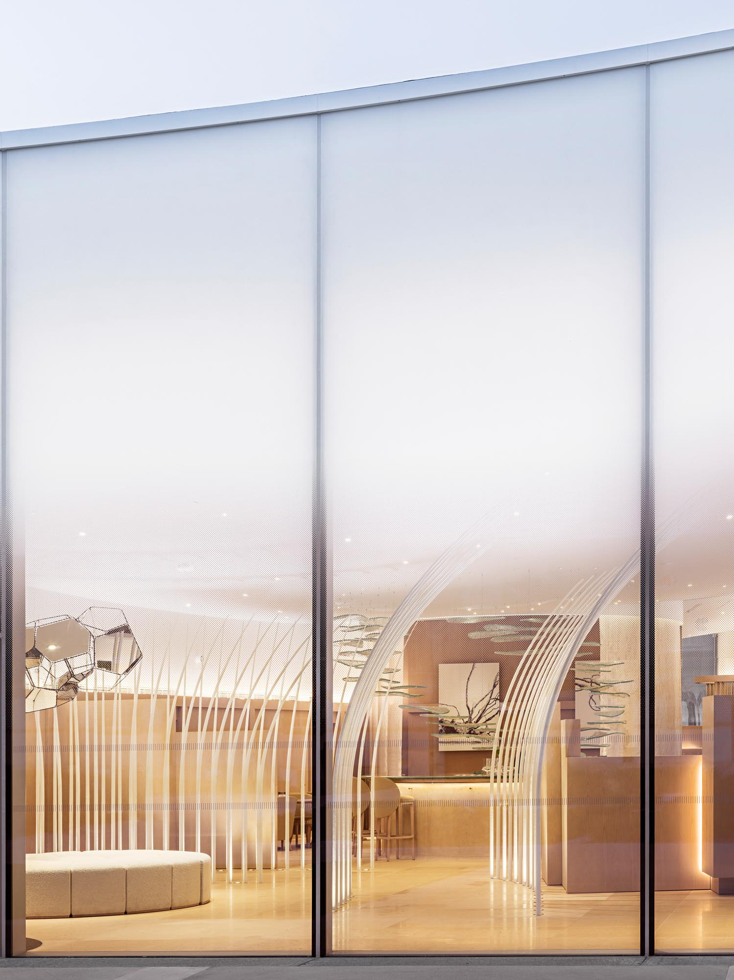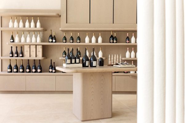Maison Ruinartの本拠地で、世界最古のシャンパンが生まれた史跡としても知られる4 Rue des Crayere に新たに建てられたパビリオンのインテリア。コンセプトは室内庭園。本質的で明るく情緒的なRuinartの美意識が広がる流線的な空間に、床から天井に向かって伸びる繊細な枝が、屋外の遺跡や室内のオブジェに視線を集めるように訪問者を導く。未来へ向かうRuinartの変容を見せる空間を、藤本壮介氏の建築、クリストフ・ゴートラン氏の庭園と共鳴を意識してデザインした。