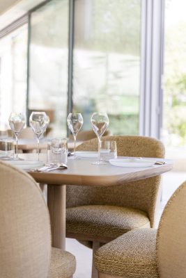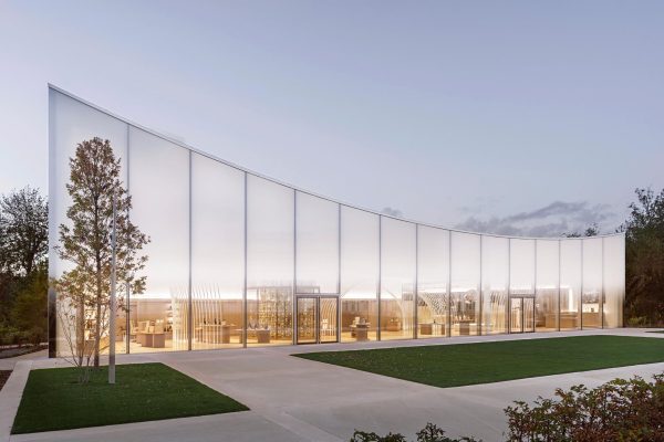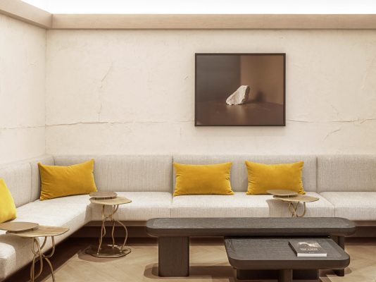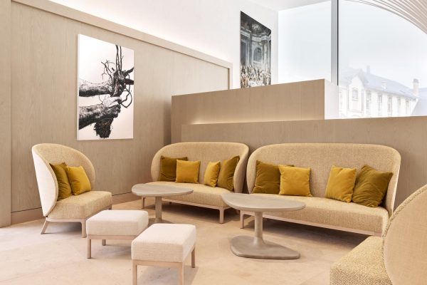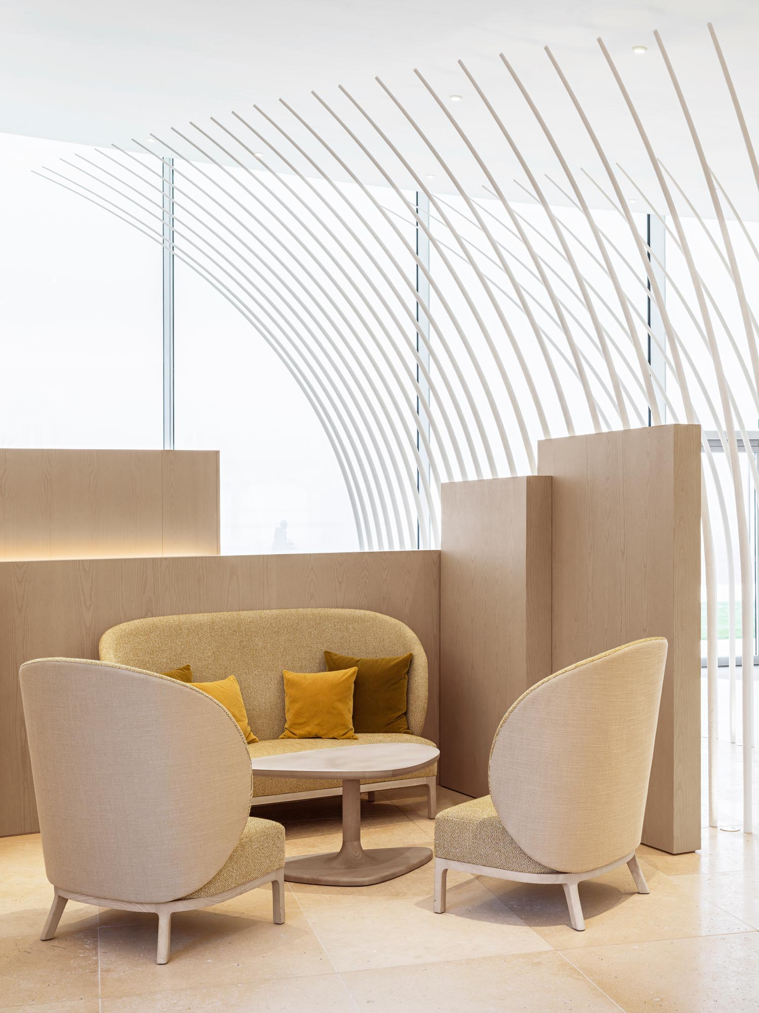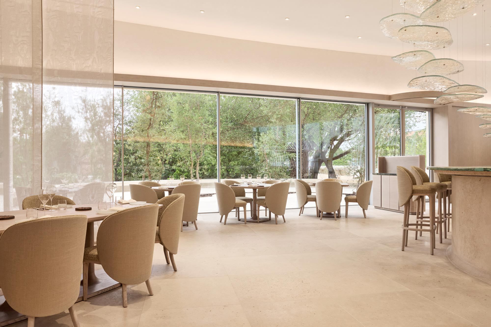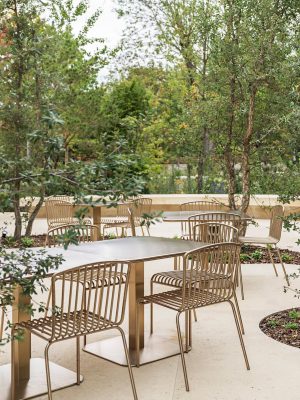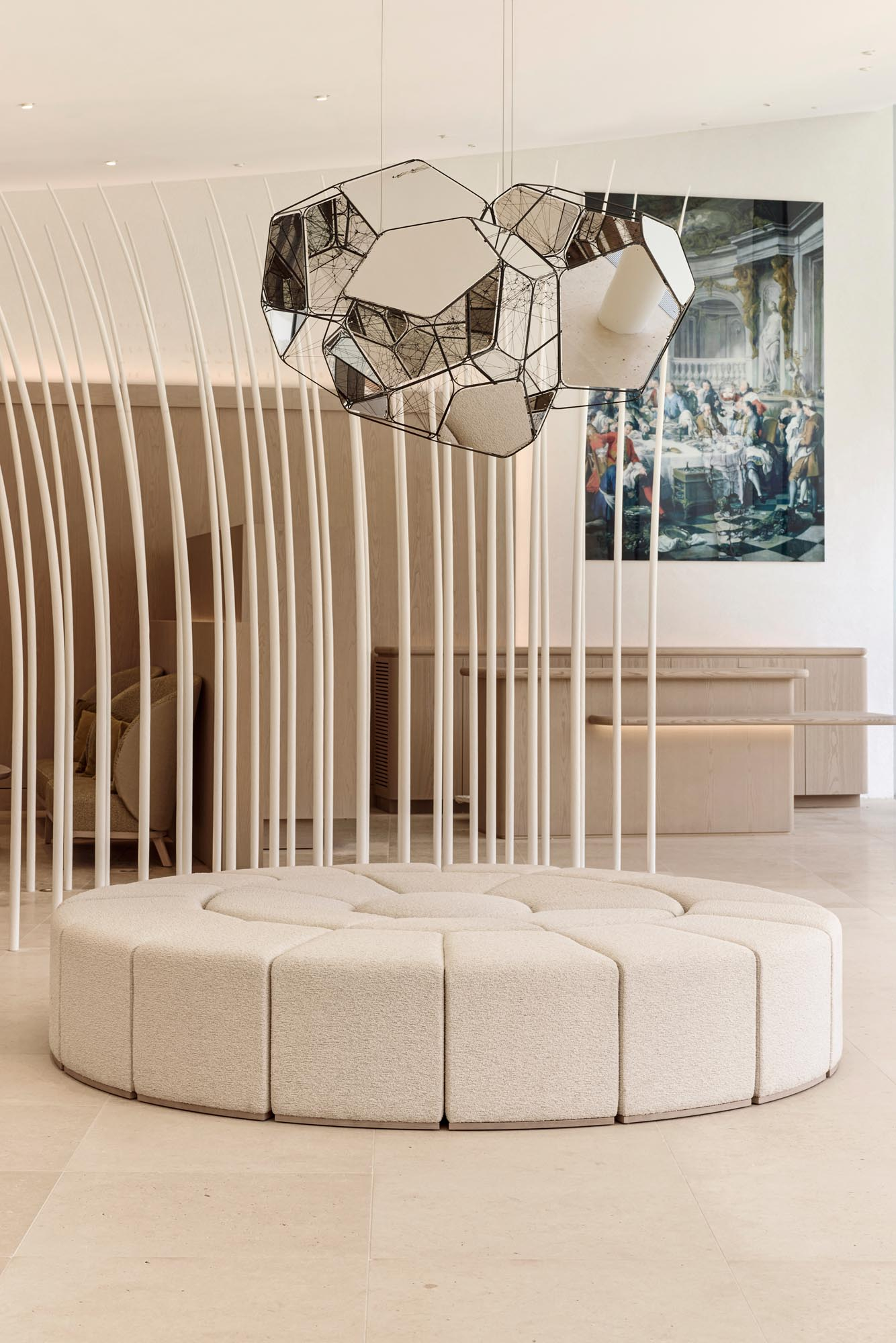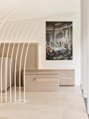 Maison Ruinartの本拠地で、世界最古のシャンパンが生まれた史跡としても知られる4 Rue des Crayere に新たに建てられたパビリオンのインテリア。コンセプトは室内庭園。本質的で明るく情緒的なRuinartの美意識が広がる流線的な空間に、床から天井に向かって伸びる繊細な枝が、屋外の遺跡や室内のオブジェに視線を集めるように訪問者を導く。未来へ向かうRuinartの変容を見せる空間を、藤本壮介氏の建築、クリストフ・ゴートラン氏の庭園と共鳴を意識してデザインした。