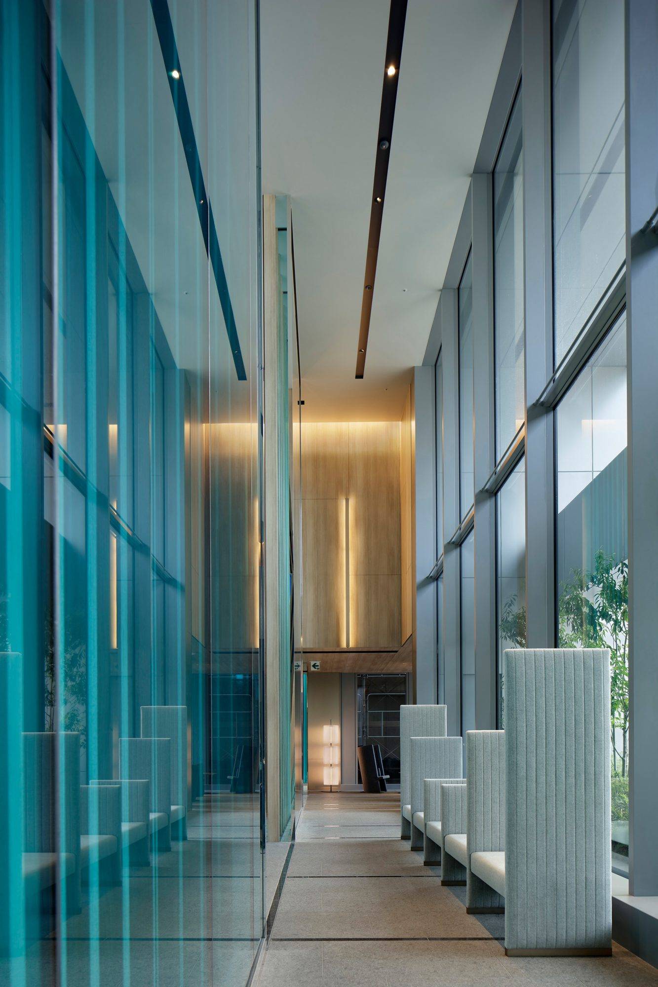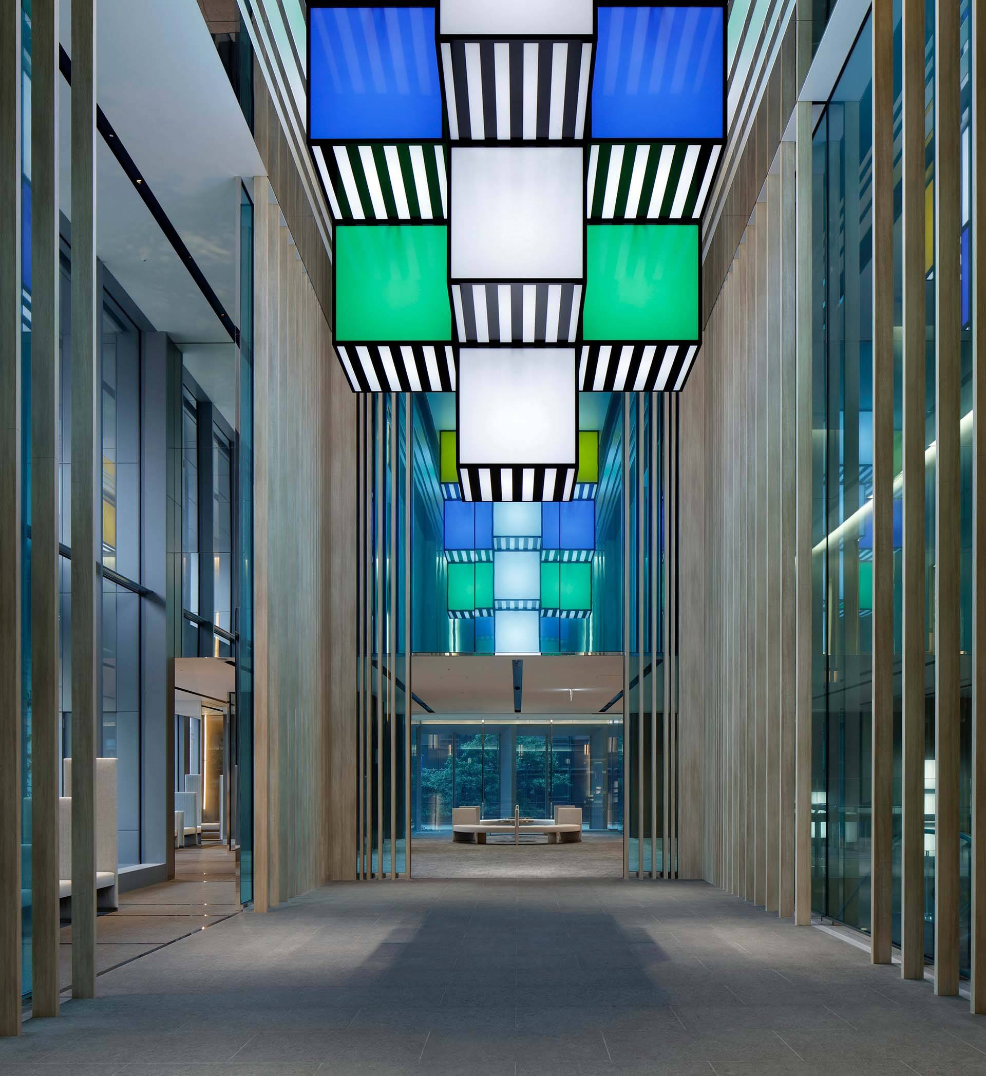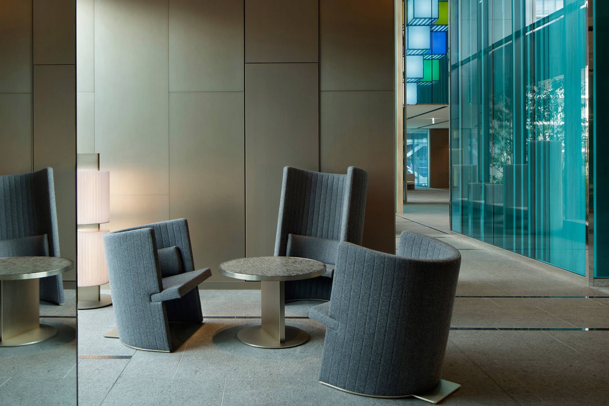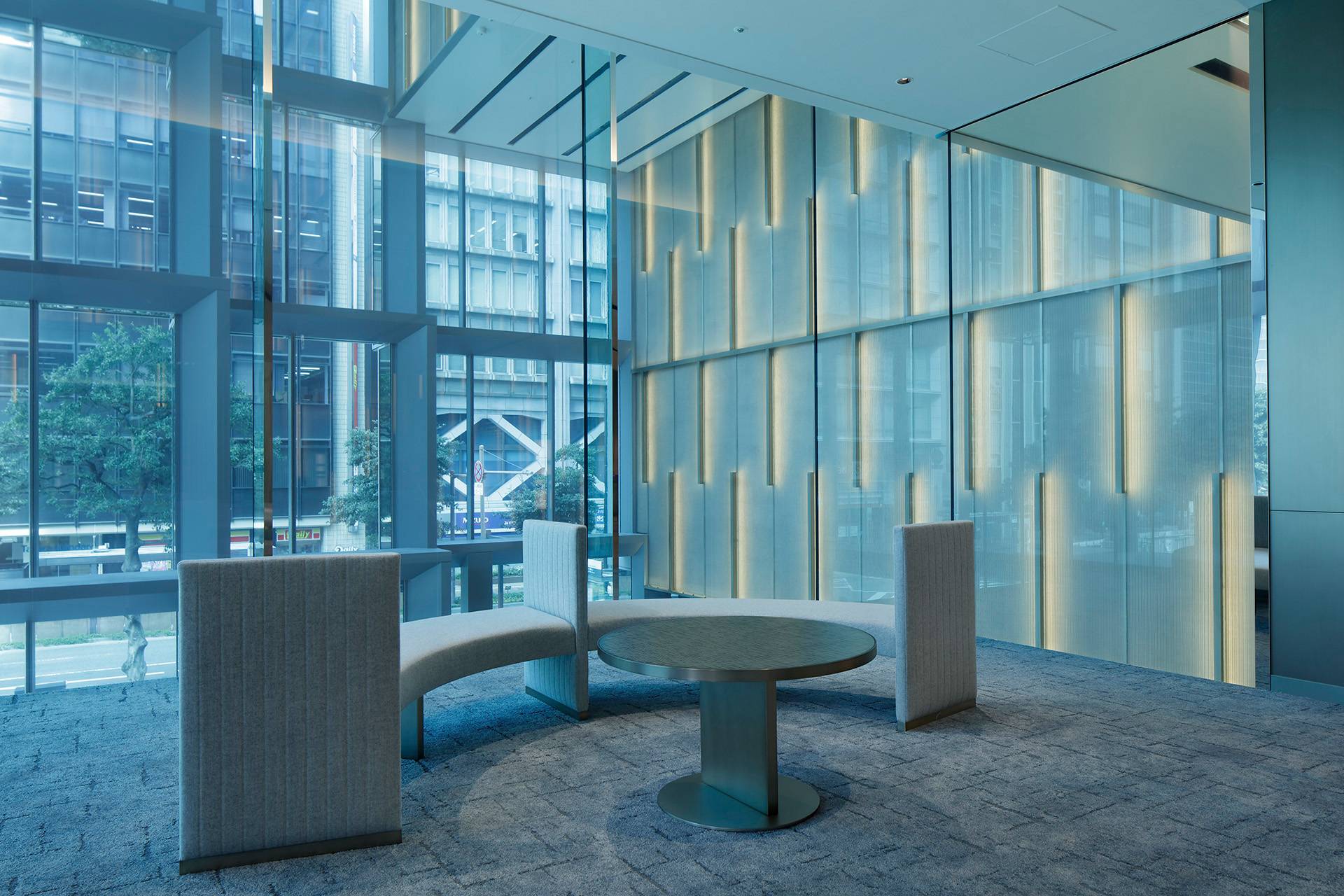 アジアのビジネス拠点として発展を期待される福岡市の都市開発「天神ビッグバン」を牽引するプロジェクト、天神ビジネスセンターのメインアトリウム、エントランス、パブリックスペースのインテリアを担当。OMAニューヨークによりピクセル状にデザインされたユニークなファサード、その一部が剥がれて入り込んだかのように透き通ったブルーの立方体が浮かぶアトリウムは、デジタルテクノロジーの未来を象徴。ファサードの姿と共鳴し、ビルそのもののアイコンとして強い存在感を放つ。オリジナルの家具、絶妙な調和を見せるダニエル・ビュレンのアートと相まって完成されたインテリアに、オフィスの未来図を表した。