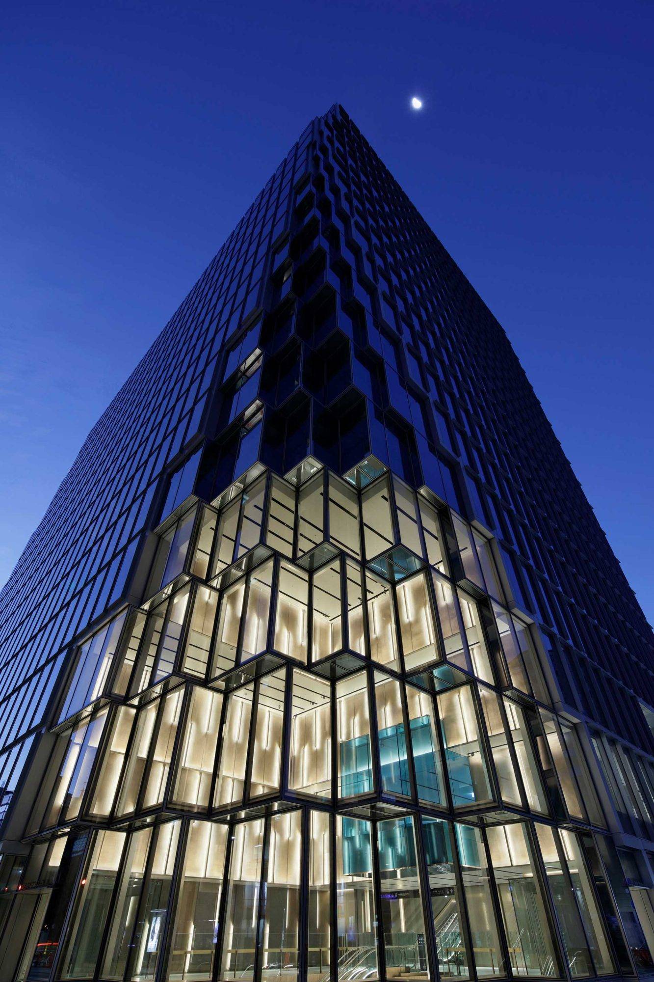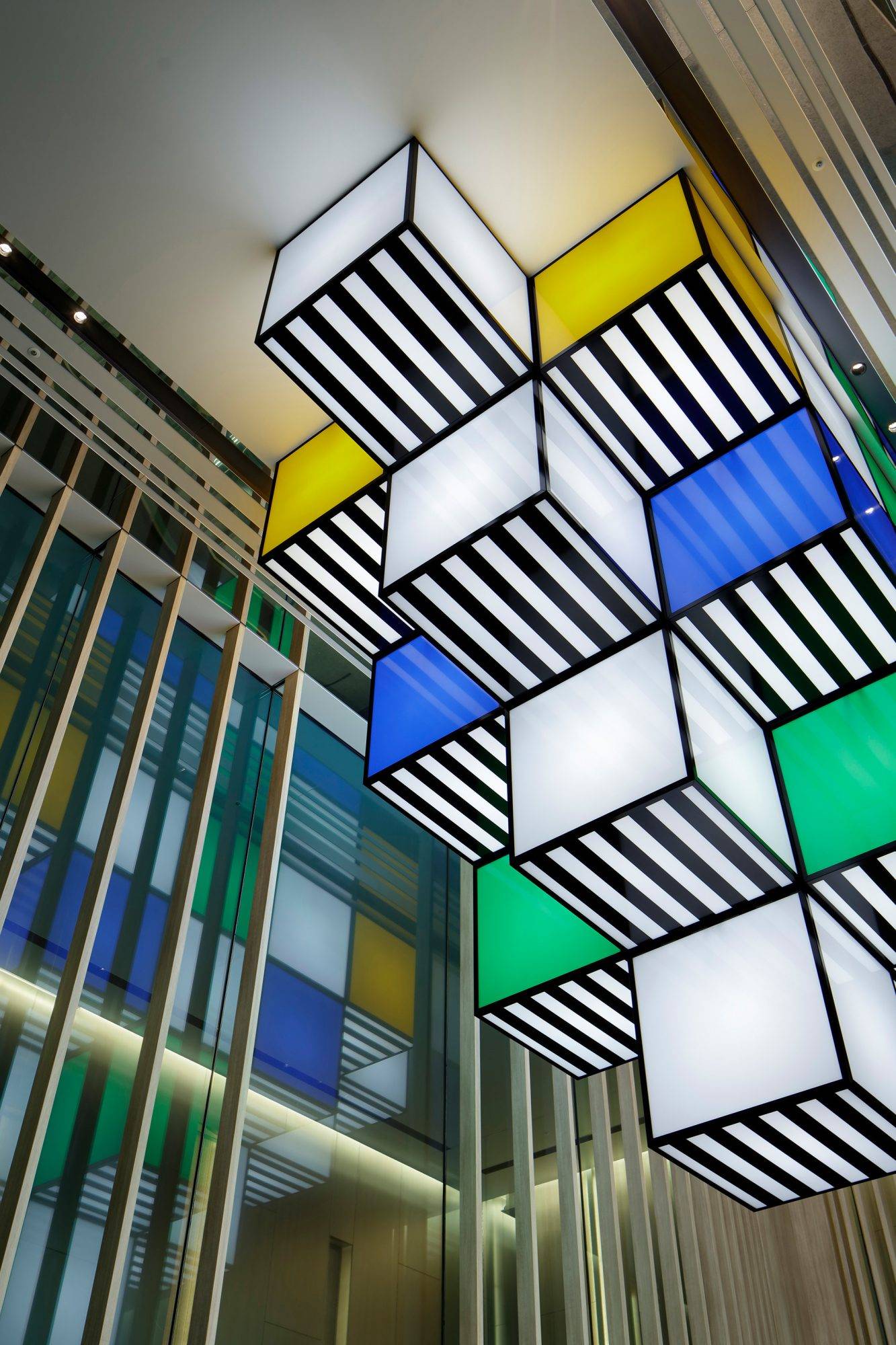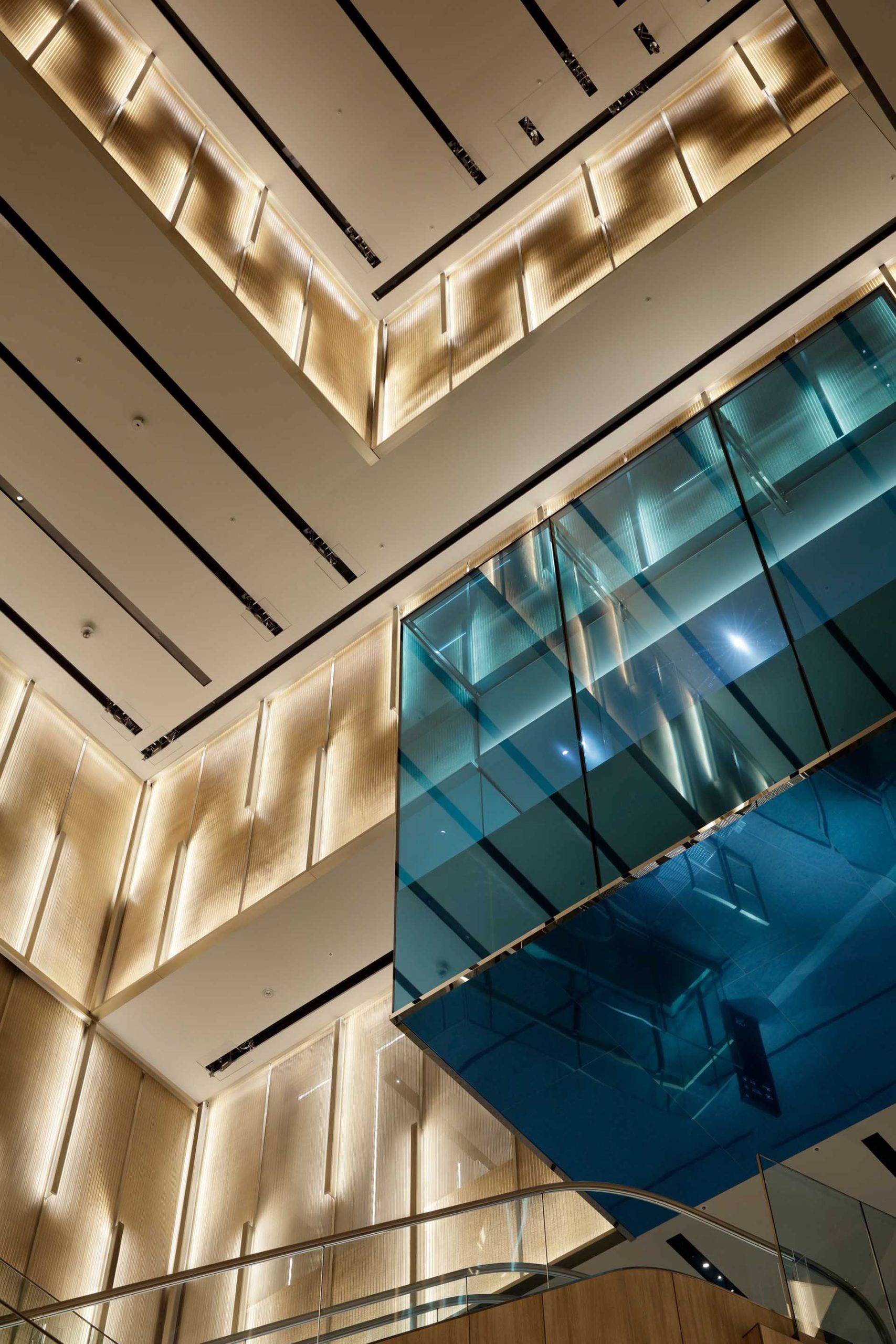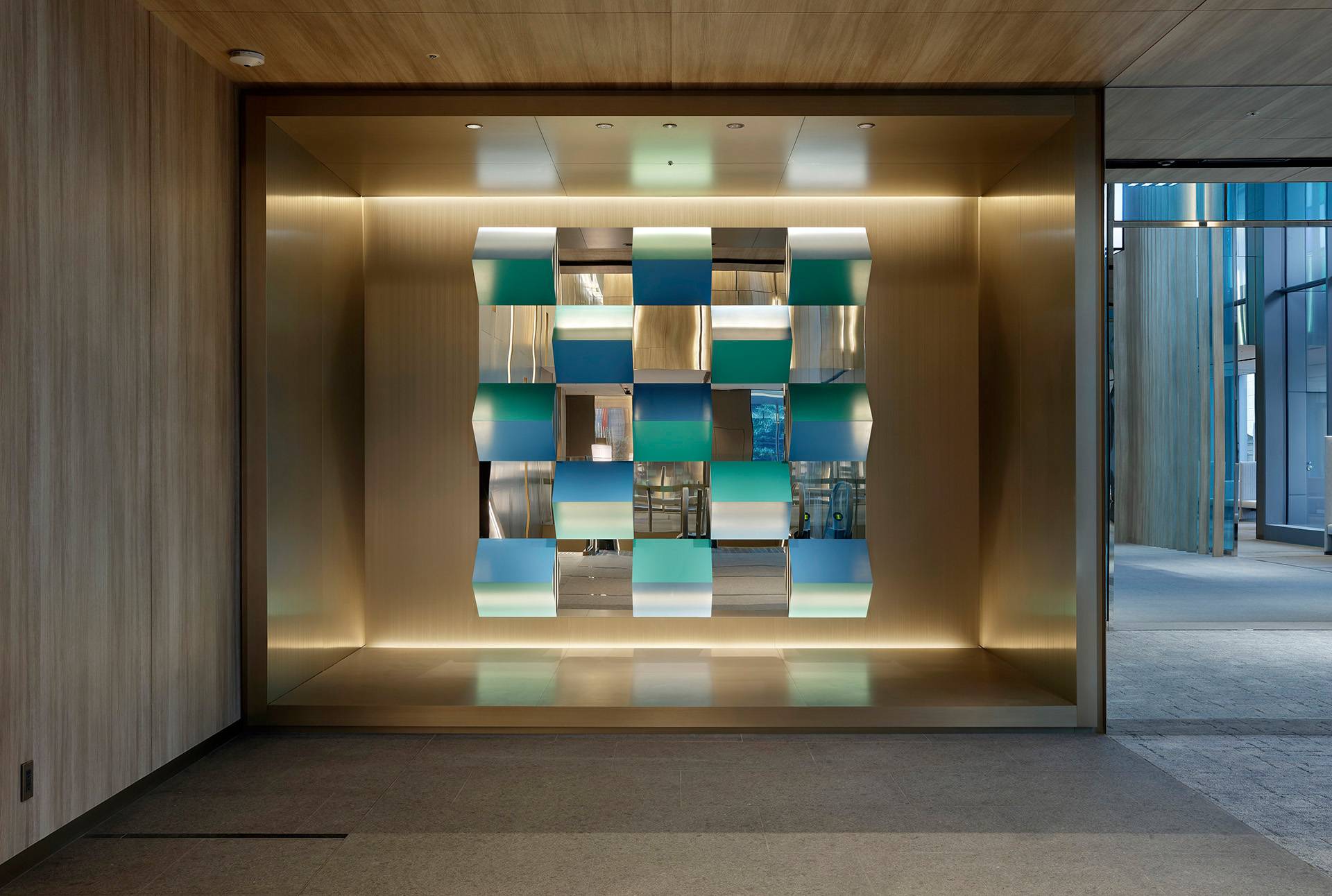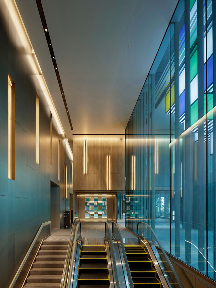アジアのビジネス拠点として発展を期待される福岡市の都市開発「天神ビッグバン」を牽引するプロジェクト、天神ビジネスセンターのメインアトリウム、エントランス、パブリックスペースのインテリアを担当。OMAニューヨークによりピクセル状にデザインされたユニークなファサード、その一部が剥がれて入り込んだかのように透き通ったブルーの立方体が浮かぶアトリウムは、デジタルテクノロジーの未来を象徴。ファサードの姿と共鳴し、ビルそのもののアイコンとして強い存在感を放つ。オリジナルの家具、絶妙な調和を見せるダニエル・ビュレンのアートと相まって完成されたインテリアに、オフィスの未来図を表した。