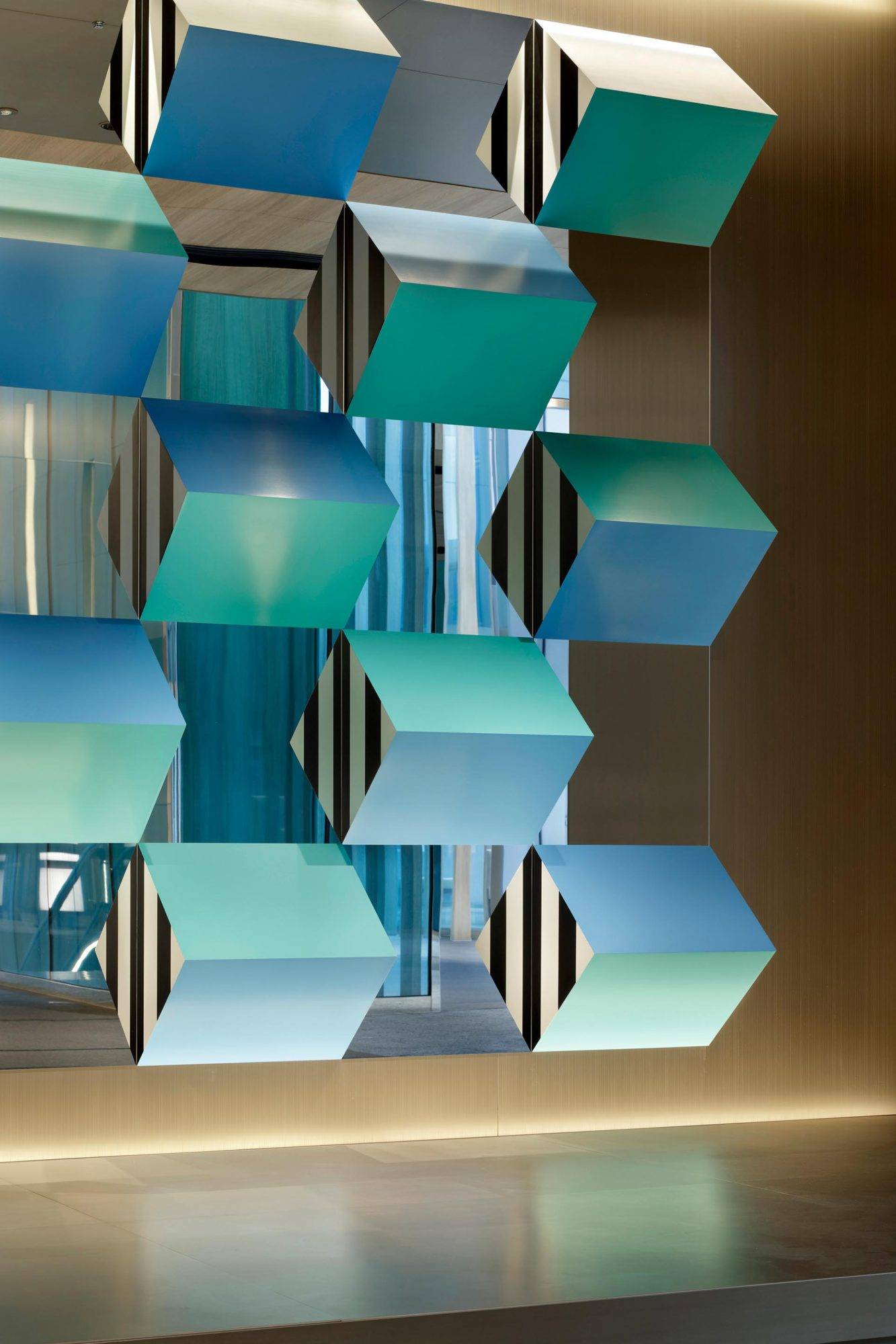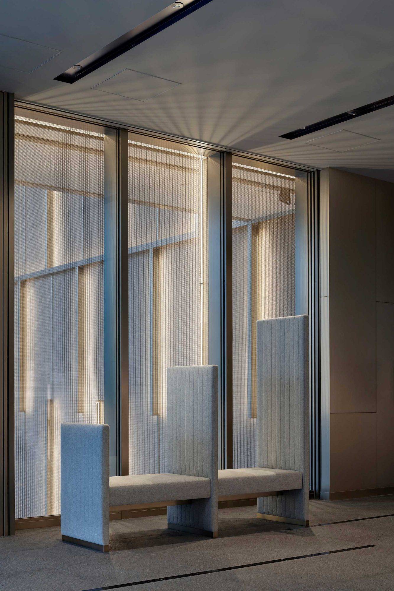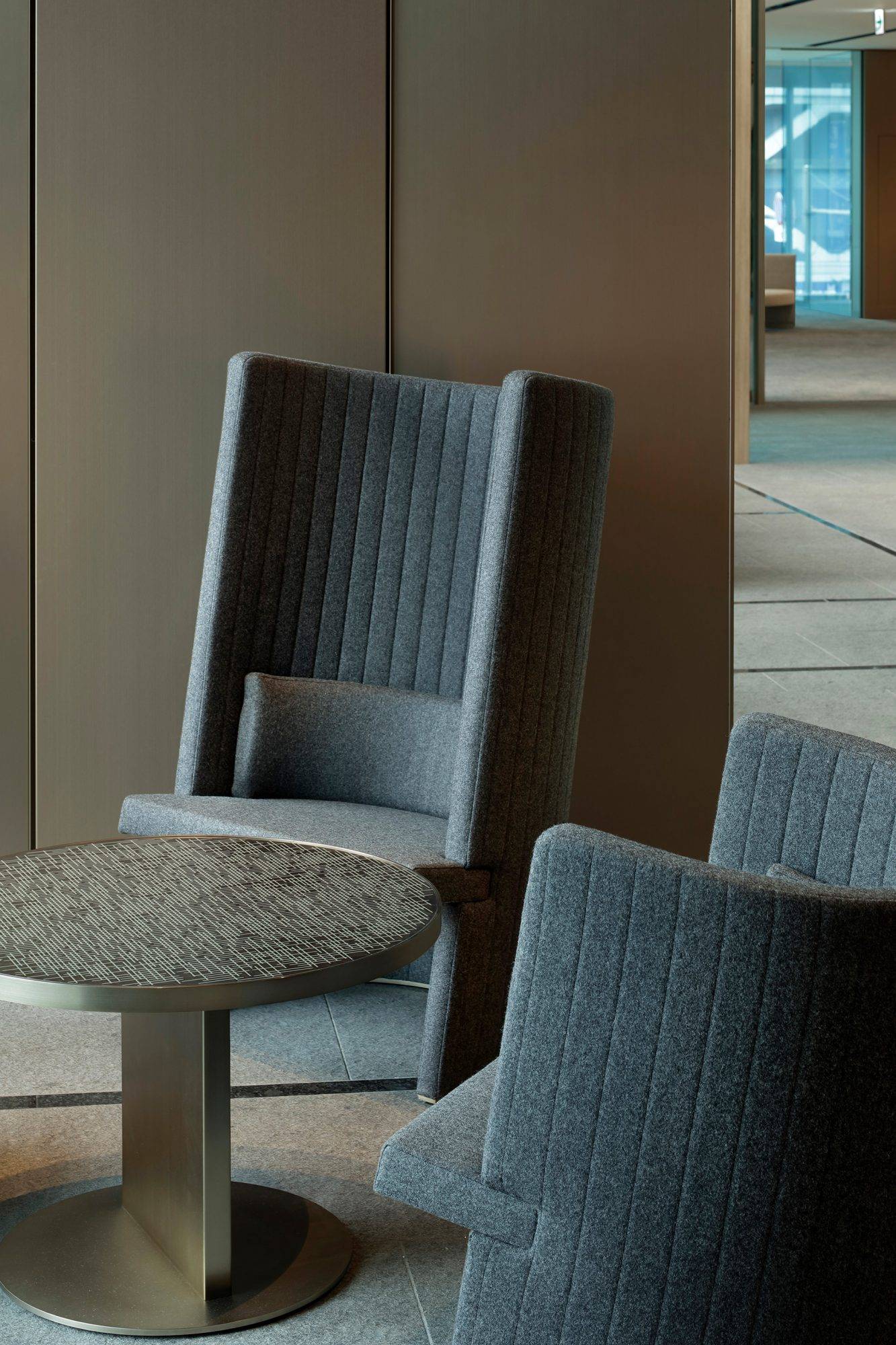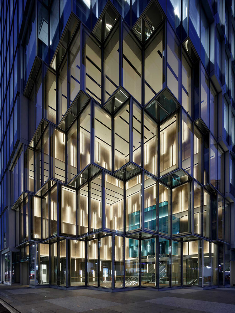 アジアのビジネス拠点として発展を期待される福岡市の都市開発「天神ビッグバン」を牽引するプロジェクト、天神ビジネスセンターのメインアトリウム、エントランス、パブリックスペースのインテリアを担当。OMAニューヨークによりピクセル状にデザインされたユニークなファサード、その一部が剥がれて入り込んだかのように透き通ったブルーの立方体が浮かぶアトリウムは、デジタルテクノロジーの未来を象徴。ファサードの姿と共鳴し、ビルそのもののアイコンとして強い存在感を放つ。オリジナルの家具、絶妙な調和を見せるダニエル・ビュレンのアートと相まって完成されたインテリアに、オフィスの未来図を表した。