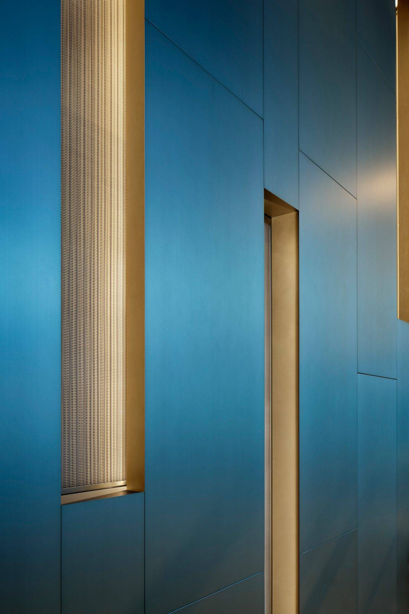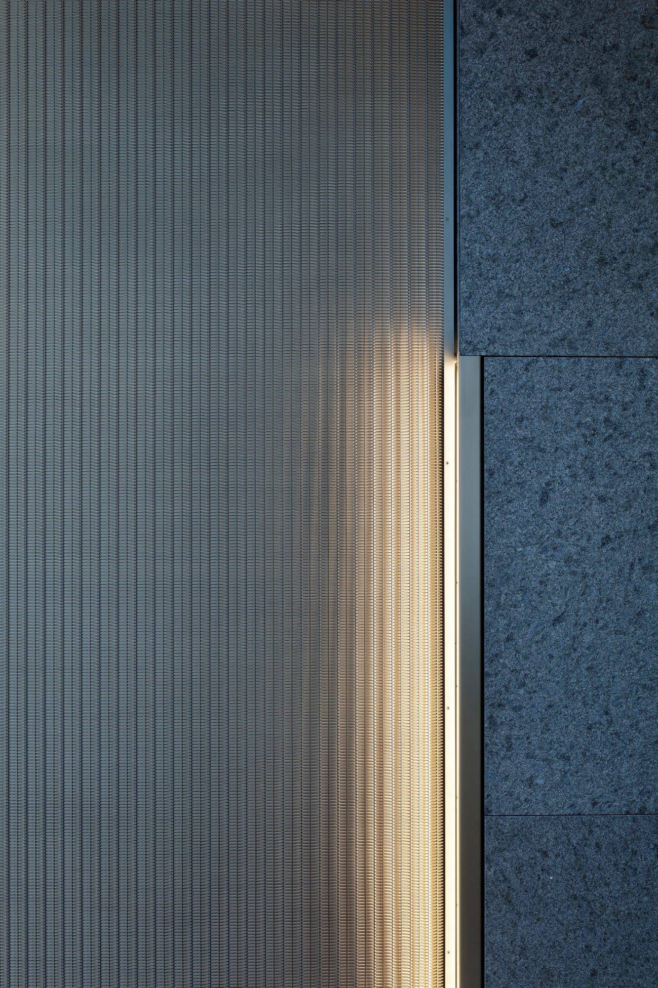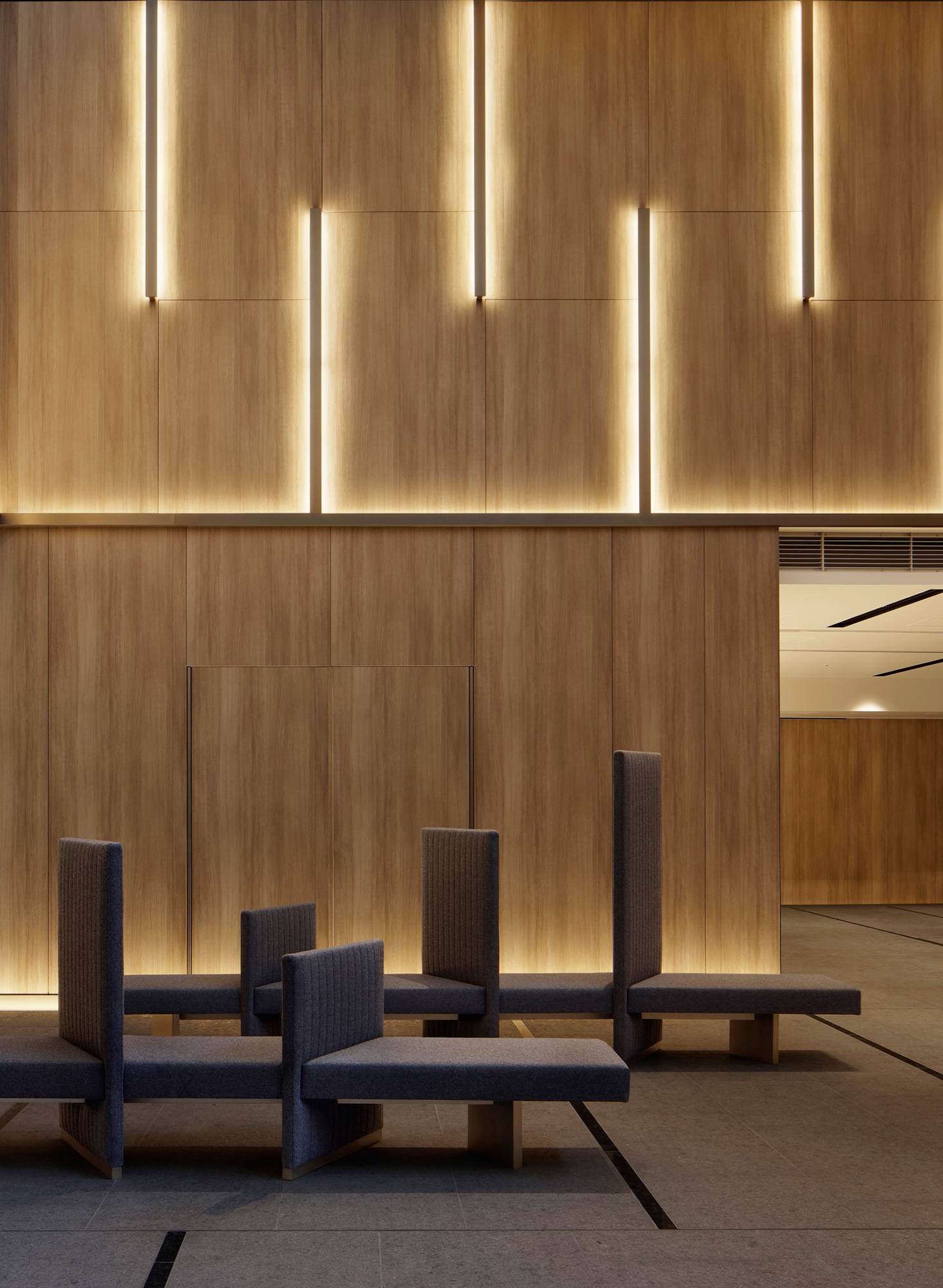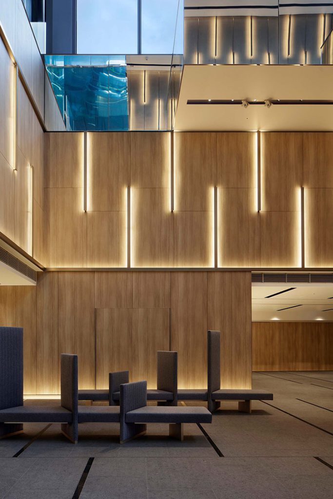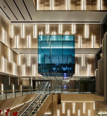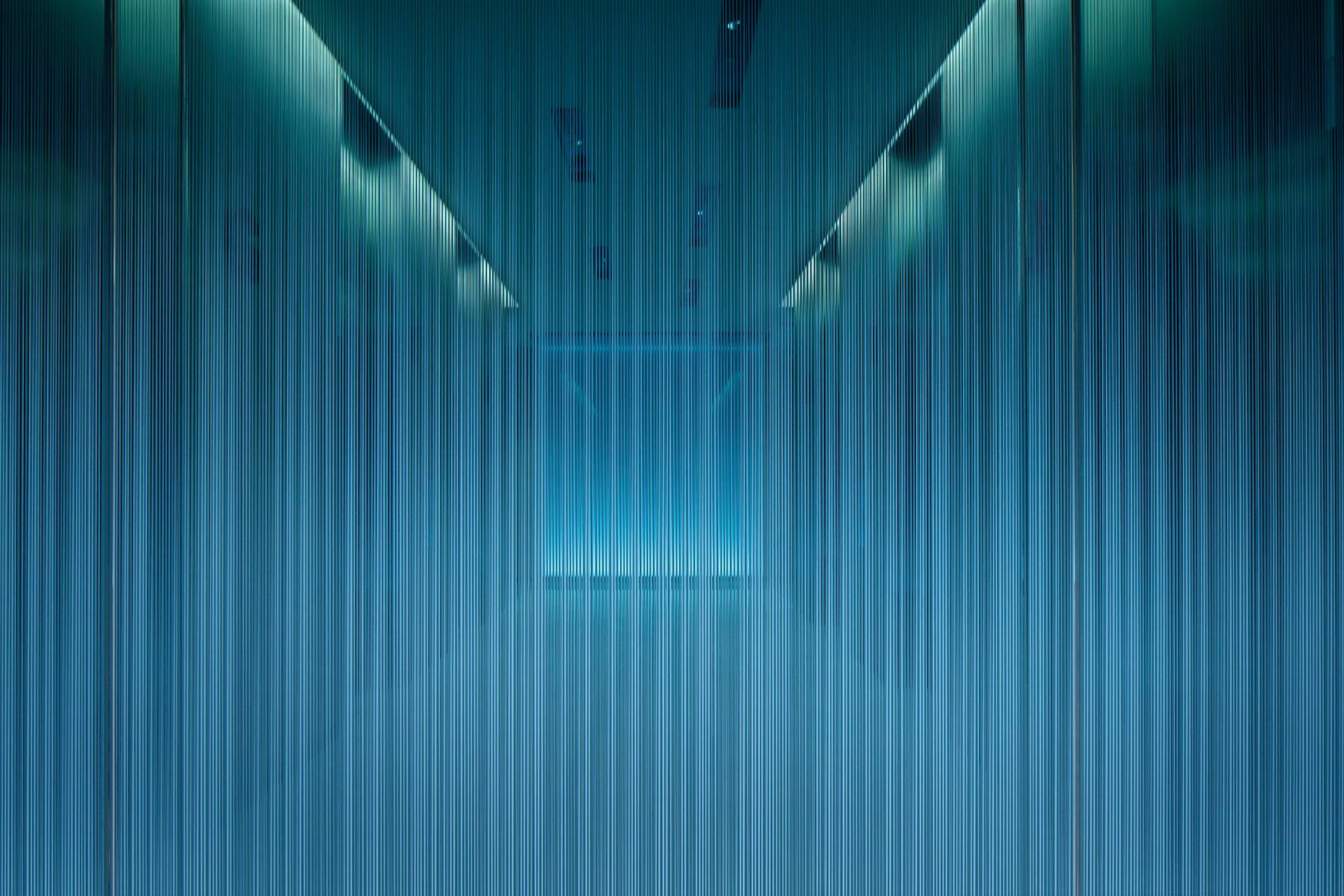 アジアのビジネス拠点として発展を期待される福岡市の都市開発「天神ビッグバン」を牽引するプロジェクト、天神ビジネスセンターのメインアトリウム、エントランス、パブリックスペースのインテリアを担当。OMAニューヨークによりピクセル状にデザインされたユニークなファサード、その一部が剥がれて入り込んだかのように透き通ったブルーの立方体が浮かぶアトリウムは、デジタルテクノロジーの未来を象徴。ファサードの姿と共鳴し、ビルそのもののアイコンとして強い存在感を放つ。オリジナルの家具、絶妙な調和を見せるダニエル・ビュレンのアートと相まって完成されたインテリアに、オフィスの未来図を表した。