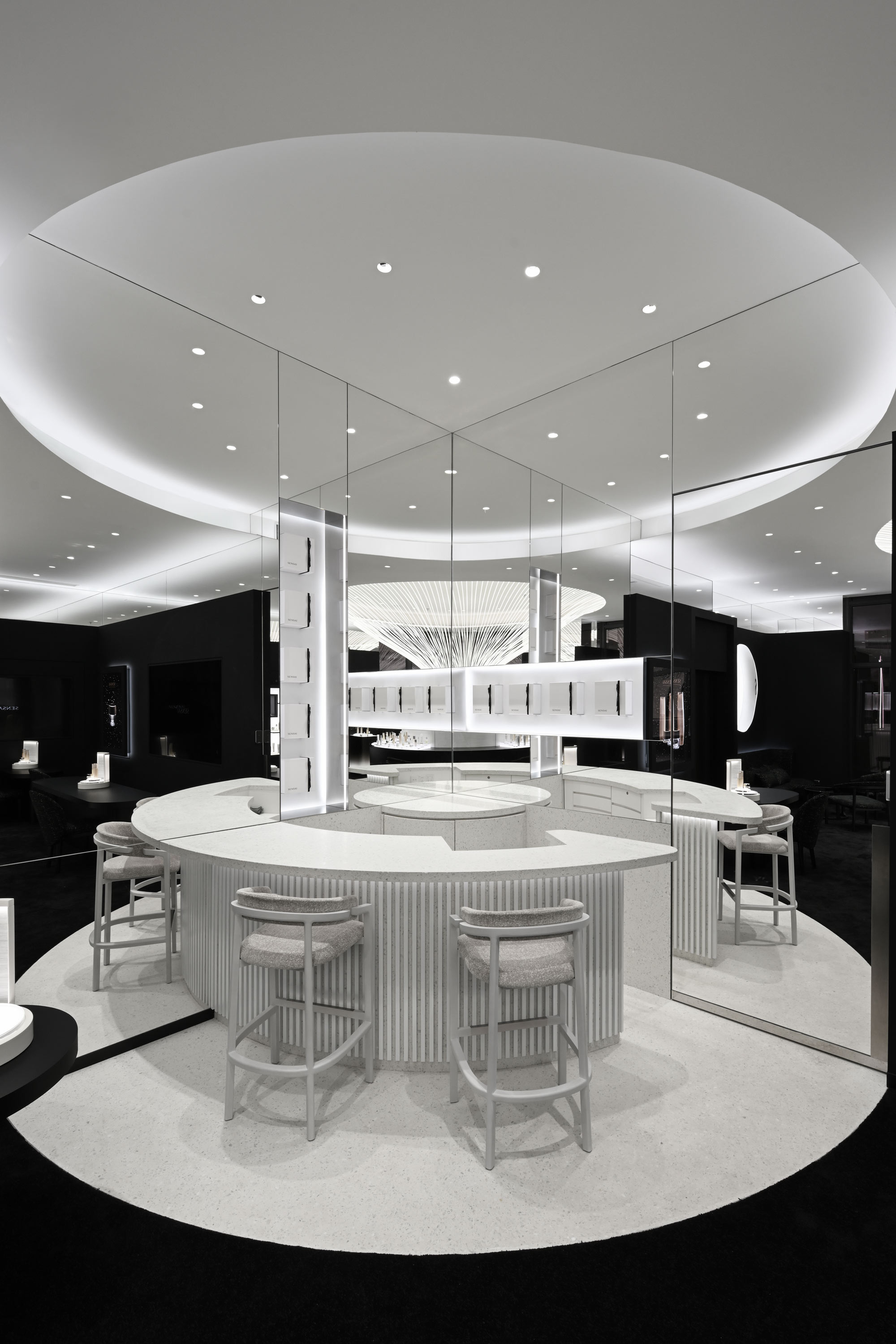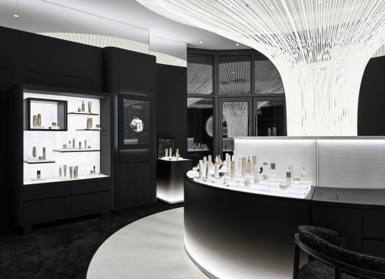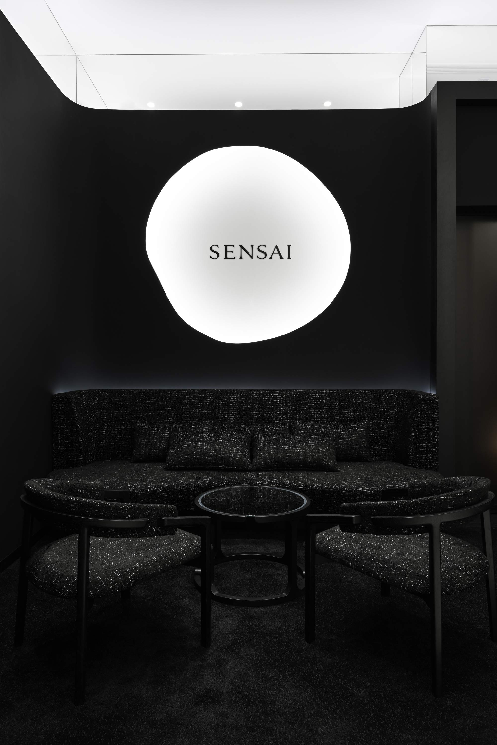 The first flagship for SENSAI, Kanebo Cosmetic's prestige brand, is designed as an "experience-based concept store" consisting of a shopping area and a spa area. The main feature of the shopping area is the chandelier with delicate strings, reminiscent of the iconic ingredient of SENSAI cosmetics, "Koishimaru Silk". The dynamic curve guides customers to the different areas of the space. Deep matte black on the wall highlights the flawless silk object, creating an atmosphere of tranquility. While creating a contemporary atmosphere in a minimal colour palette, it expresses the traditional Japanese aesthetic that the brand has been offering globally for many years.
